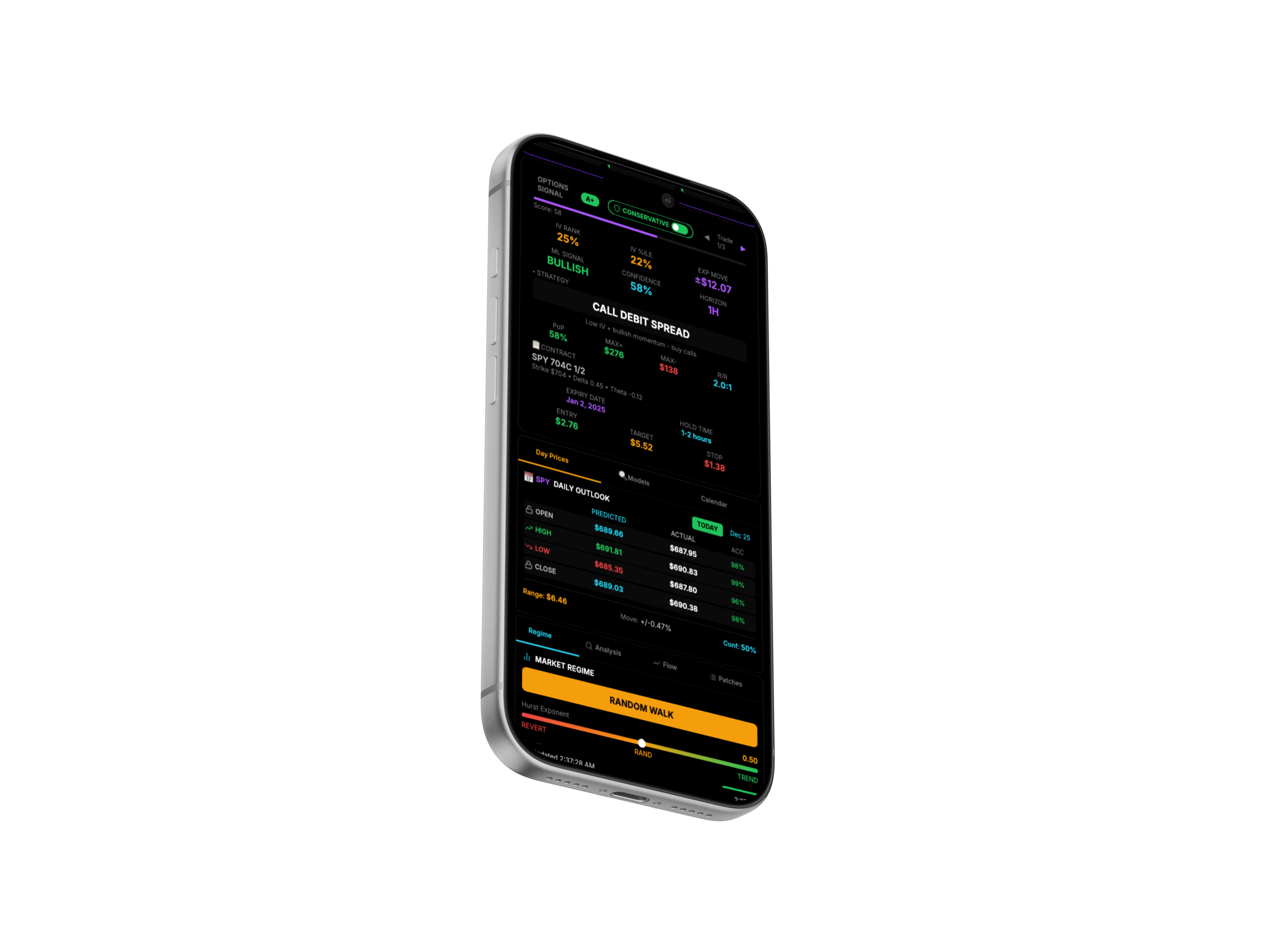 127 market signals. 7 ensemble models. 6 timeframes. Directional forecasts for SPY, QQQ, and the Magnificent 7 with full signal attribution on every call.